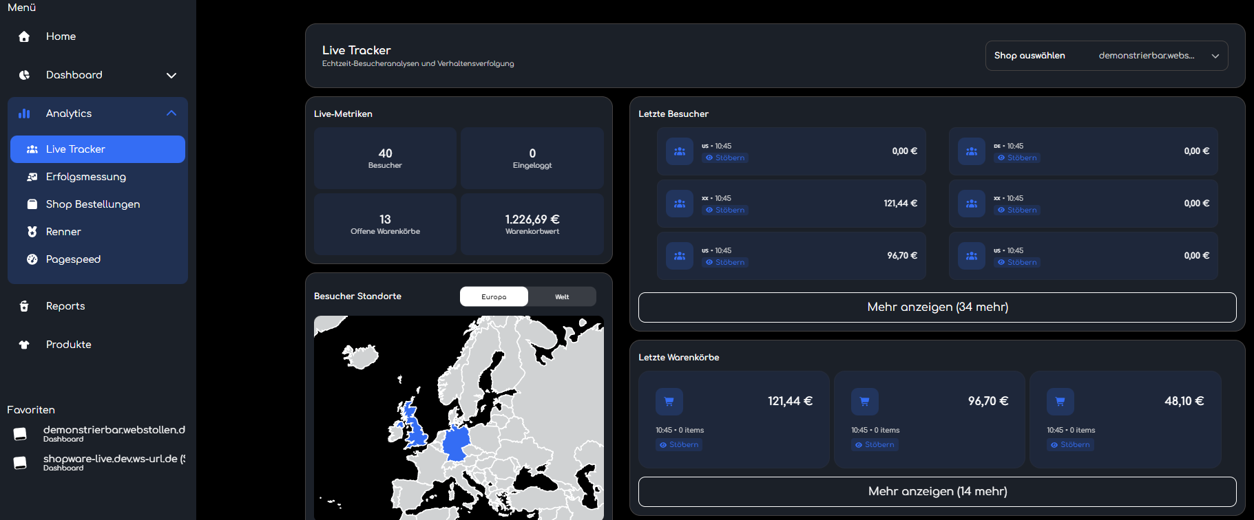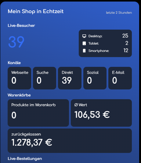 Mit dem dash.bar Live-Tracker siehst du live, was gerade in deinem Shop passiert. Der Live Tracker ist auf deiner HOME Seite, unter Analytics und als Widget verfügbar.