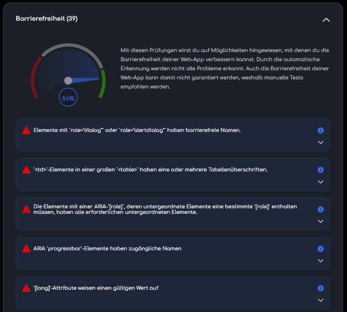 Hier findest du laufend den Stand deiner Barrierefreiheit. Per Klick auf den Pfeil bekommst du noch detaillierte Anweisungen, was du noch tun musst, um Barrieren zu beseitigen.