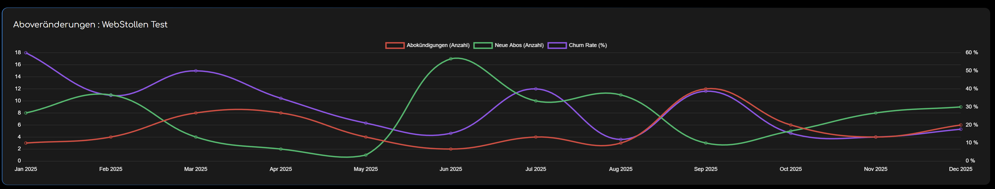 Darunter ist ein Graph abgebildet, der Auskunft über neue und gekündigte Abos in dem jeweiligen Monat gibt. Außerdem zeigt es die Churn Rate. Die Churn Rate wird wie folgt berechnet: