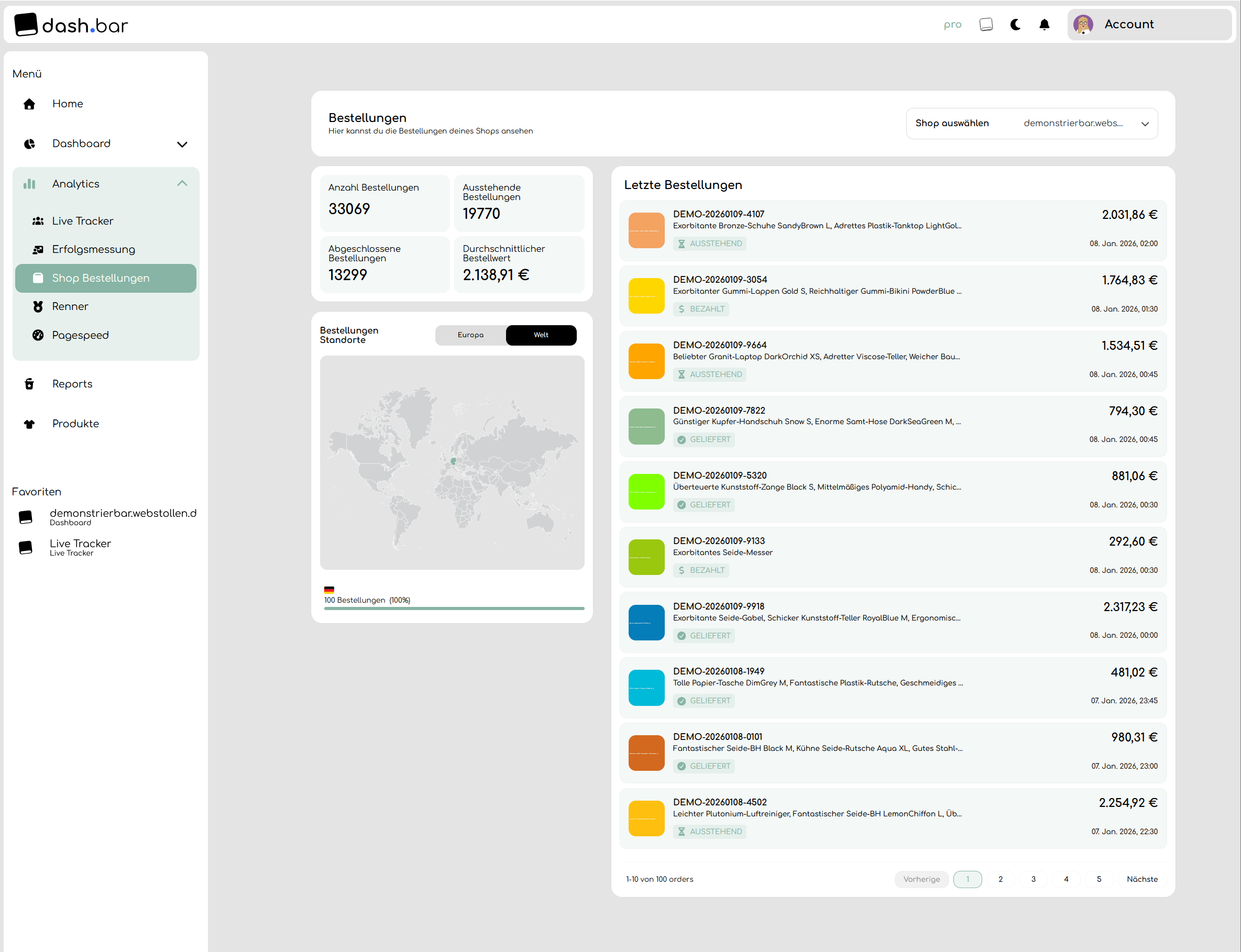 Die Übersicht über die in deinem Shop eingegangene Bestellungen findest du im Web unter dem Analytics-Tab und in der dash.bar App durch Klicken auf das entsprechende Dashboard-Widget.