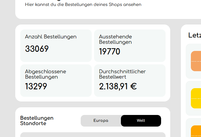 Hier erhältst du einige wichtige Kennzahlen zu den Bestellungen in dem von dir ausgewählten Shop.