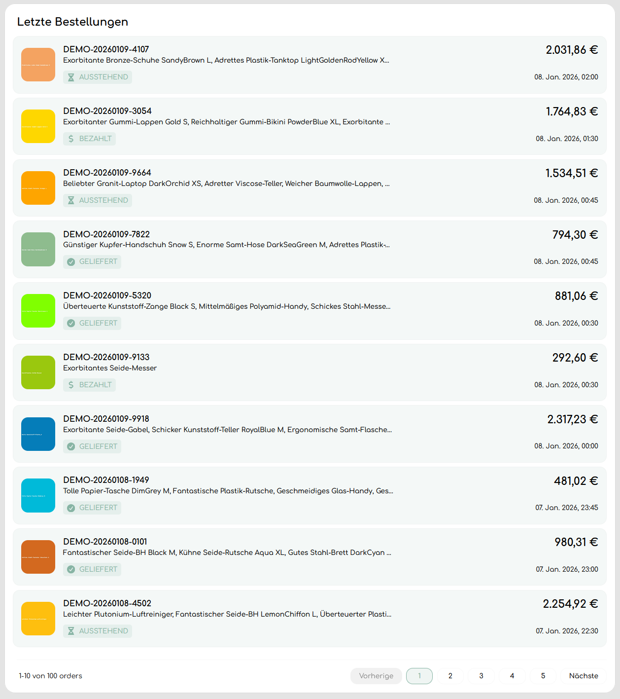 Mit etwas Verzögerung siehst du hier eine Auflistung der letzten 100 in dem ausgewählten Shop eingegangenen Bestellungen.