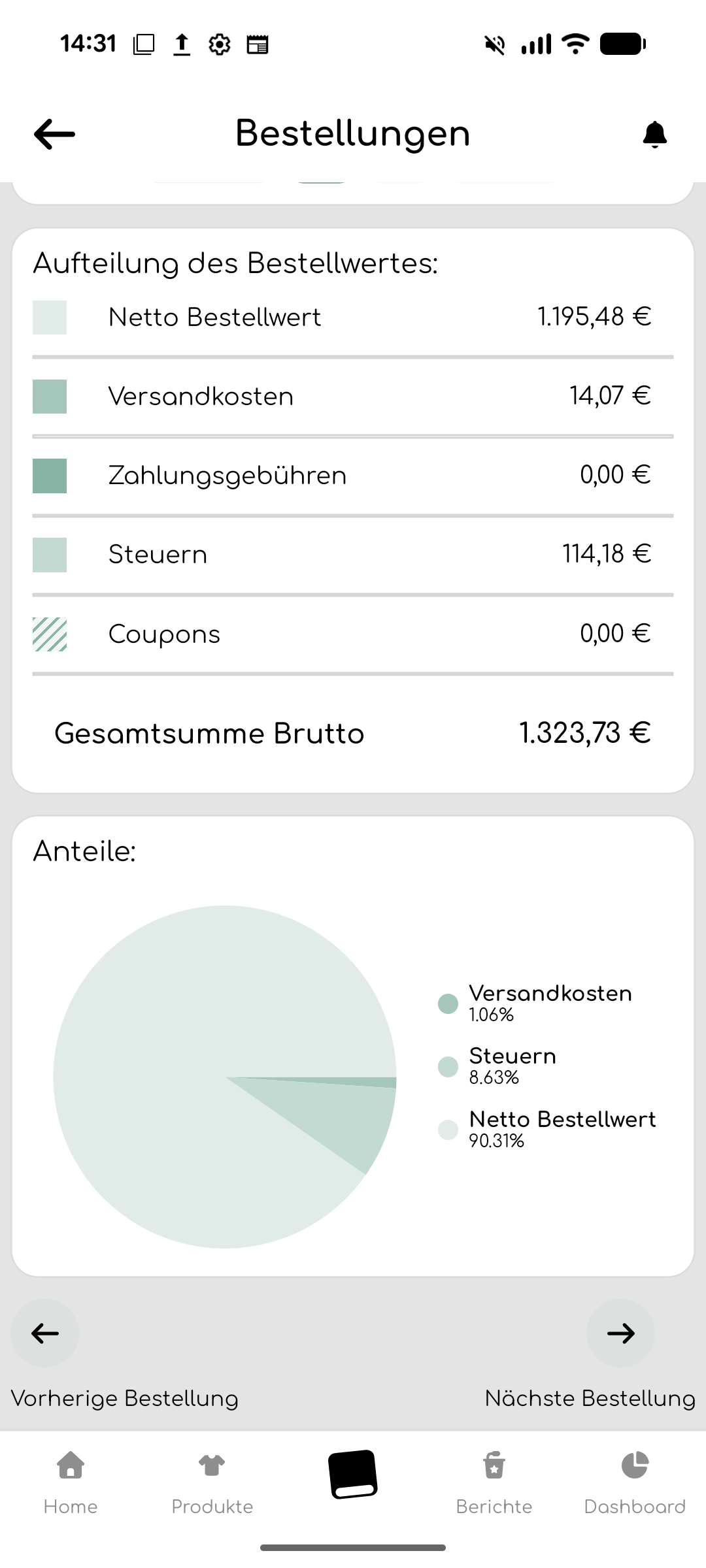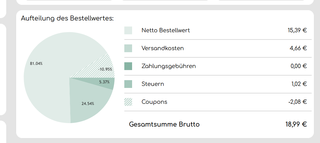 Unten rechts wird dir eine detaillierte Aufschlüsselung des vom Kunden gezahlten Preises angezeigt und in dem nebenstehenden Tortendiagramm noch einmal visualisiert.