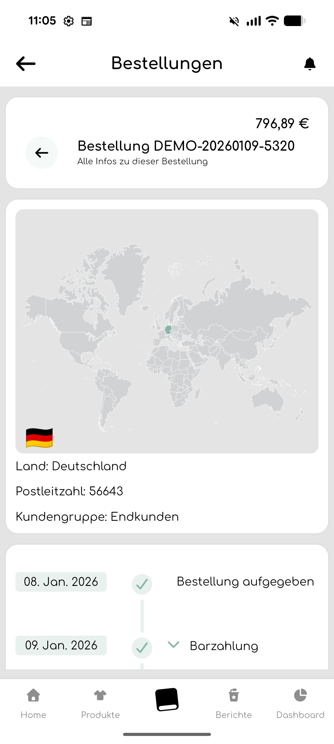 Hier erhältst du Aufschluss darüber, welche Stationen des Bestellprozesses die Bestellung bereits durchlaufen hat und wann das passiert ist.