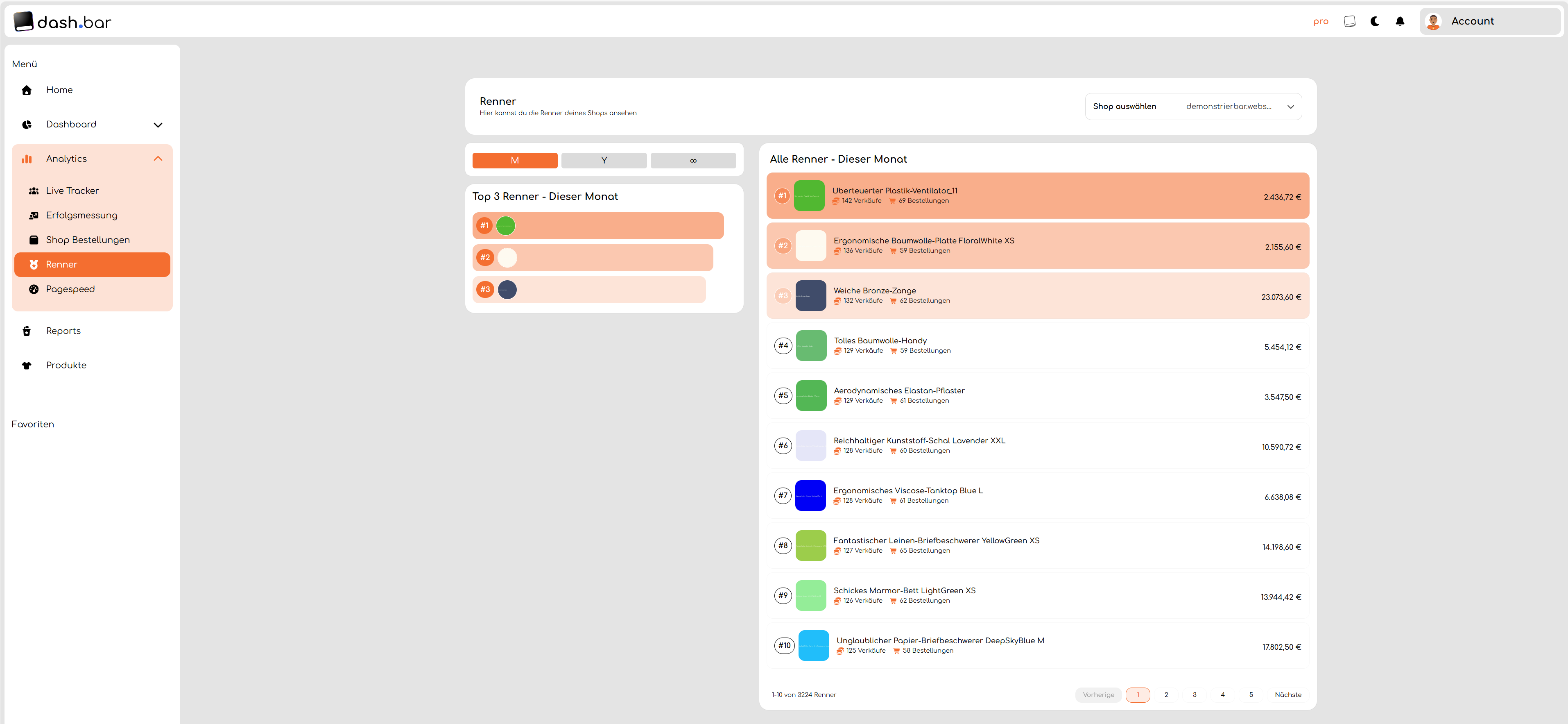 Die Übersicht über deine Renner Artikel in deinem Shop findest du im Web unter dem Analytics-Tab und in der dash.bar App über die Schaltfläche in der Home-Seite oder über einen Klick im Dashboard auf das Renner Widget.